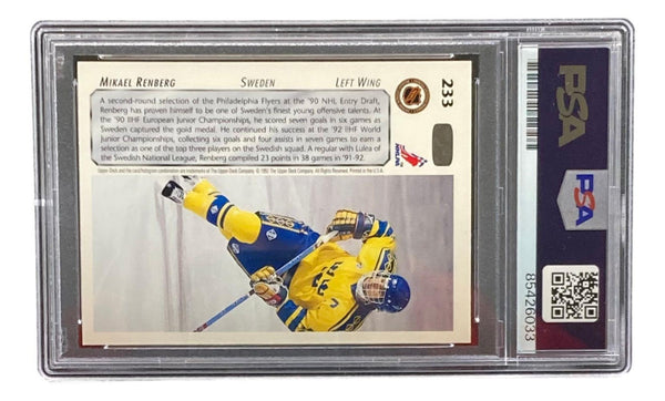 Featured is a Mikael Renberg signed 1992 Upper Deck #233 trading card. This card has been hand signed by Renberg and has been encapsulated and authenticated by PSA. This card would make a great addition to any sports memorabilia collection! SPECIFICATIONS Autographed By: Mikael Renberg Team: Philadelphia Flyers Sport: Hockey Authentication: Professional Sports Authenticator (PSA)