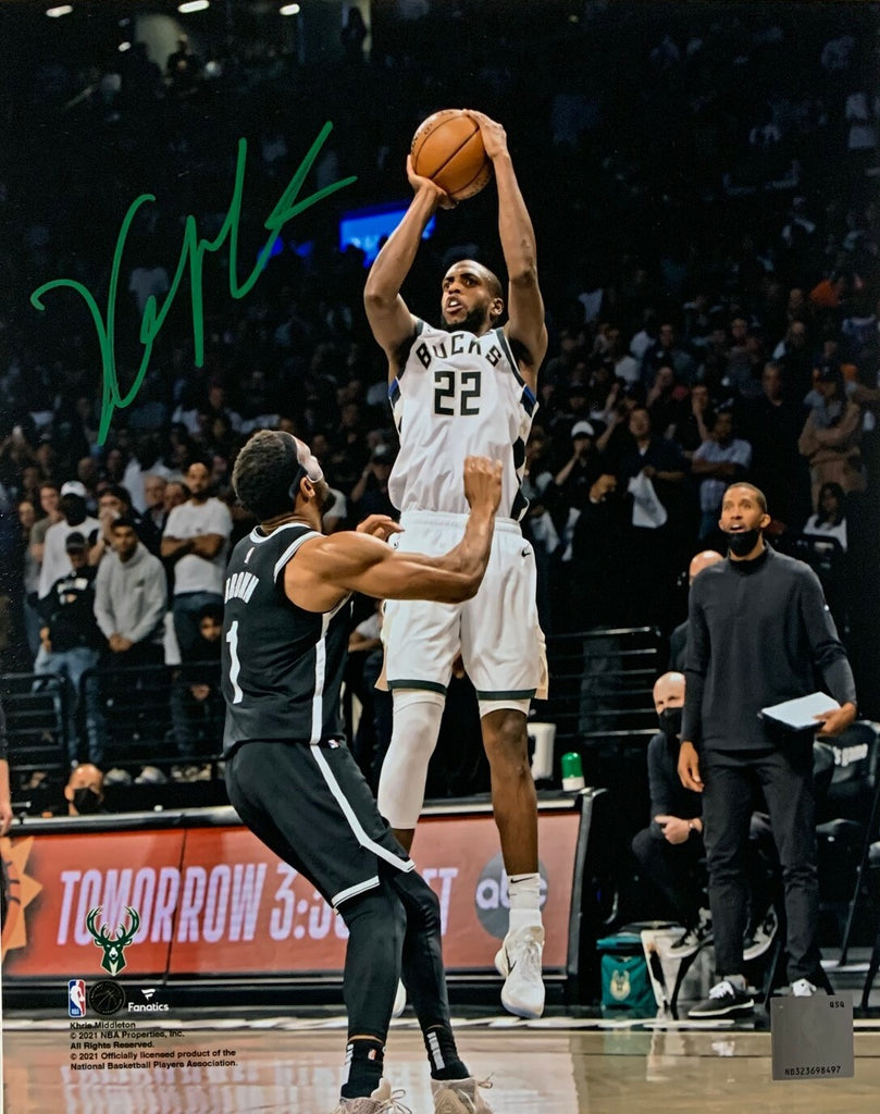 An 8x10 hand signed photo of Milwaukee Bucks All Star KHRIS MIDDLETON The signature is in Green Paint Pen . This photo was signed at a private signing with us. This would make a great addition to any Bucks collection! This item is guaranteed to be 100% authentic and will include a COA from Waukesha Sportscards with matching serial numbered holograms.