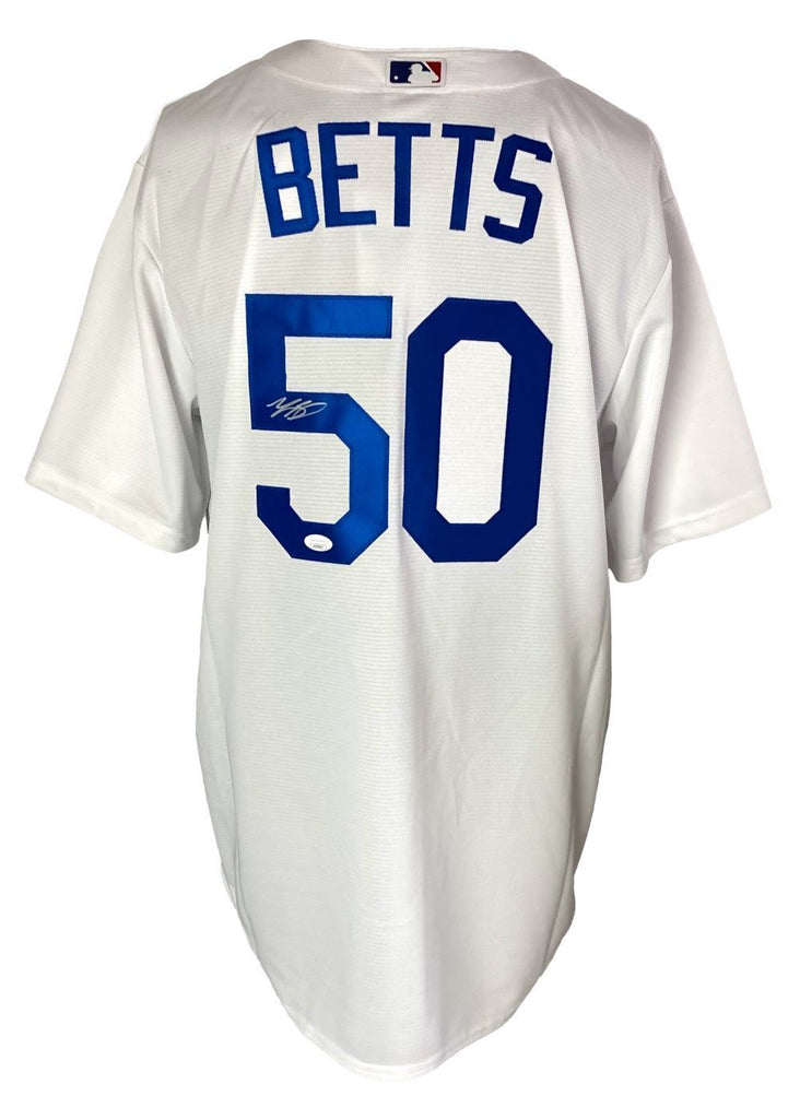 Featured is a Mookie Betts signed Los Angeles Dodgers Nike replica baseball jersey. This jersey has been hand signed by Betts and comes with the JSA hologram and certificate of authenticity. This jersey size may vary. This jersey would make a great addition to any sports memorabilia collection!. SPECIFICATIONS Autographed By: Mookie Betts Team: Los Angeles Dodgers Sport: Baseball Authentication: James Spence Authentication (JSA)