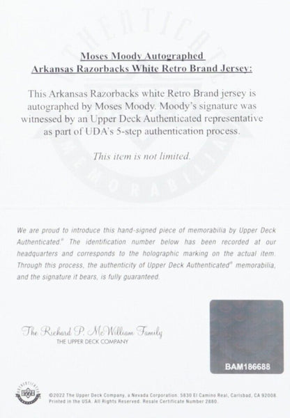 Retro Brand style jersey with everything sewn on, size XL. Hand-signed by Moses Moody.The autograph(s) includes an official Upper Deck Authenticated (UDA) hologram and matching COA for authenticity purposes.Authentication: UDA COA