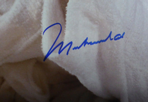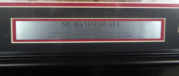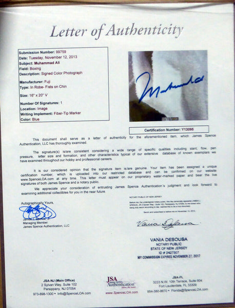 This is a framed 16x20 photo, approximately 24x28 with the frame, that has been hand signed by Muhammad Ali. It has been authenticated by JSA and comes with their sticker and matching full page certificate of authenticity.A A