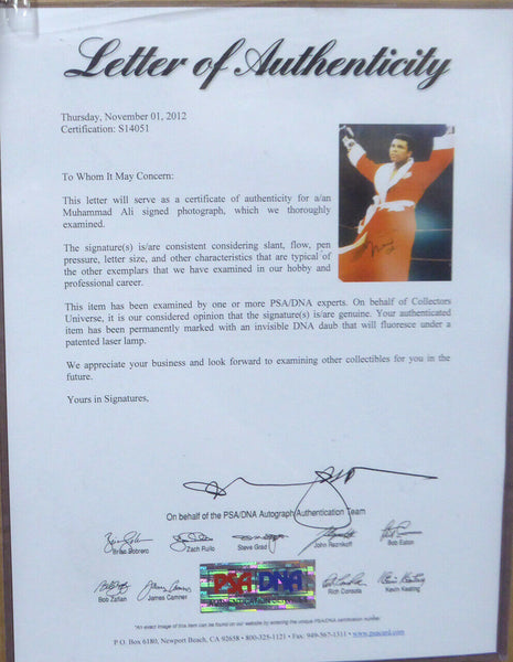 This is a framed 16x20 photo, approximately 24x28 with the frame, that has been hand signed by Muhammad Ali. It has been authenticated by PSA/DNA and comes with their sticker and matching full page certificate of authenticity.A A