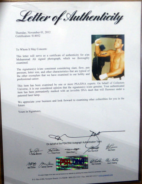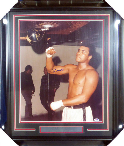 This is a framed 16x20 photo, approximately 24x28 with the frame, that has been hand signed by Muhammad Ali. It has been authenticated by PSA/DNA and comes with their sticker and matching full page certificate of authenticity.A A