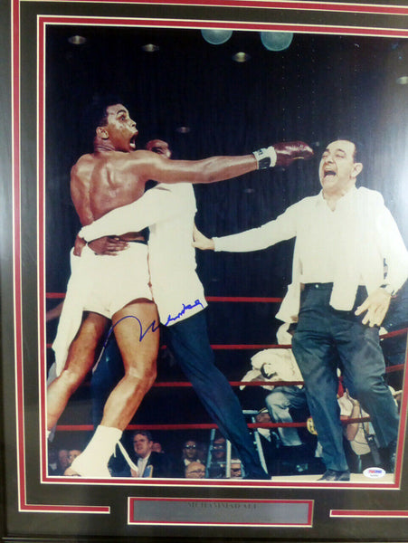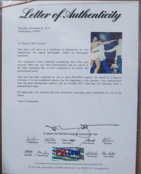This is a framed 16x20 photo, approximately 24x28 with the frame, that has been hand signed by Muhammad Ali. It has been authenticated by PSA/DNA and comes with their sticker and matching full page certificate of authenticity.A A
