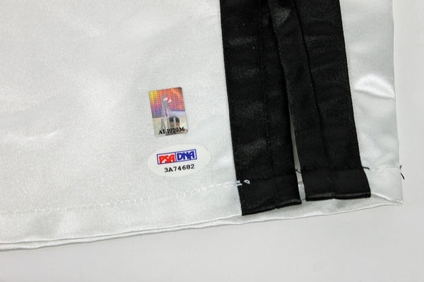 This is a Ali Boxing Trunks Authentic Signed that has been Personally Signed & Autographed by Muhammad Ali. This item is 100% Authentic to include a Certificate of Authenticity (COA) / hologram by PSA/DNA ITP #3A74682. This is a PSA/DNA In The Presence item which means a PSA representative was present when this item was being signed. The Muhammad Ali authentication hologram is also on the trunks.We offers a 100% Lifetime Guarantee on all Autographed & Signed Muhammad Ali memorabilia.