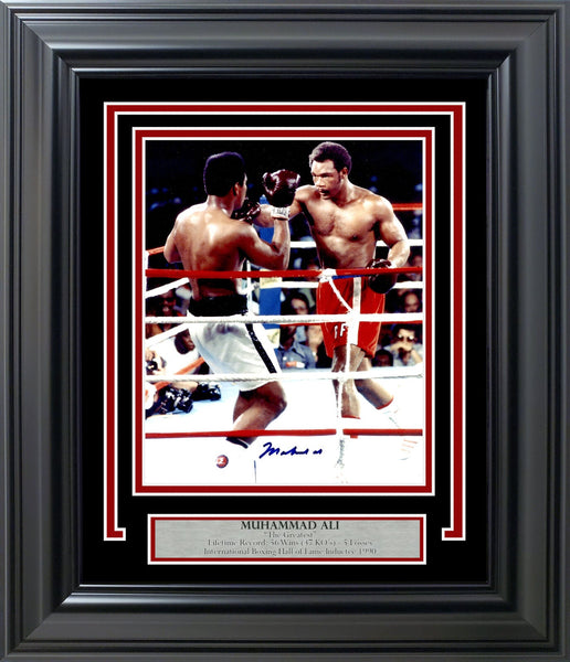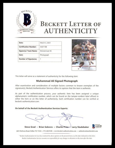 This is a Framed 8x10 Photo, approximately 15x18 with the frame, that has been hand signed by Muhammad Ali. This item has been certified authentic by Beckett Authentication (BAS) and comes with their tamper-proof sticker and matching full-page certificate of authenticity.
