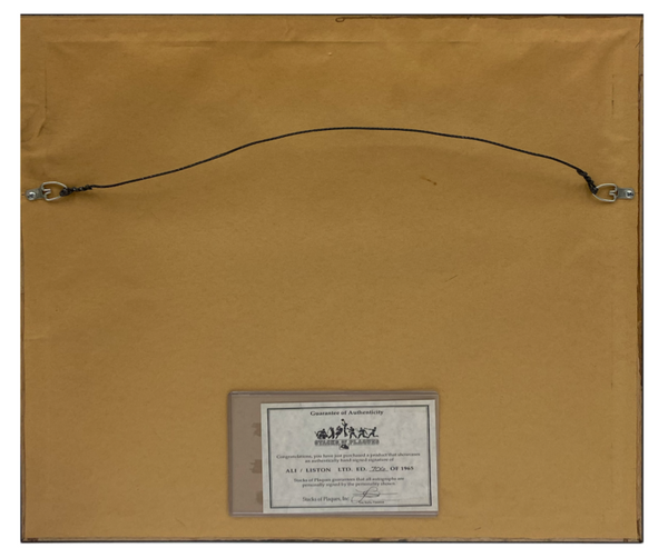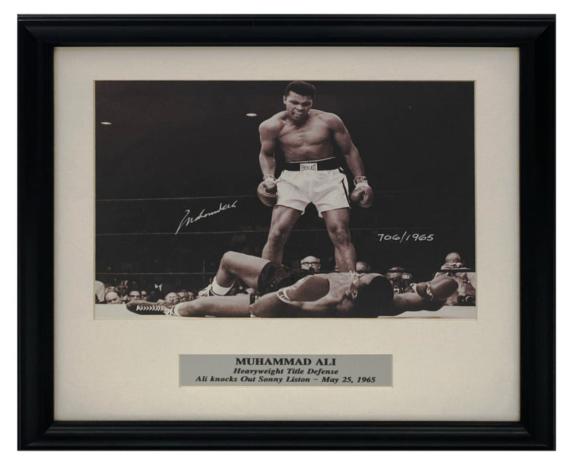 This 11" x 14" photograph of Muhammad Ali standing over Sonny Liston is the perfect addition to any collection. This photo has been custom framed and measures 19" x 19". This limited edition print comes complete with the 'Stacks of Plaques' certificate of authenticity. Personally Autographed by Muhammad Ali