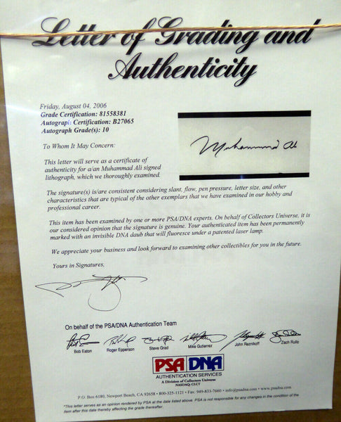 This is a Framed 18x24 Photo, approximately 26x32 with the frame, that has been hand signed by Muhammad Ali. The signature has been graded a Gem Mint 10 by PSA. It has been certified authentic by PSA/DNA and comes with their sticker and matching full page certificate of authenticity.