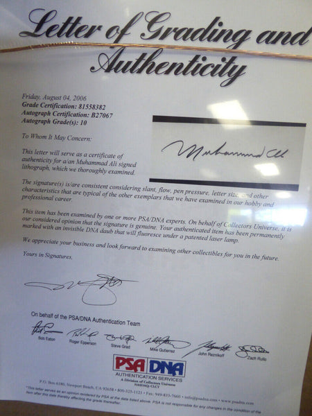 This is a Framed 18x24 Photo, approximately 26x32 with the frame, that has been hand signed by Muhammad Ali. The signature has been graded a Gem Mint 10 by PSA. It has been certified authentic by PSA/DNA and comes with their sticker and matching full page certificate of authenticity.