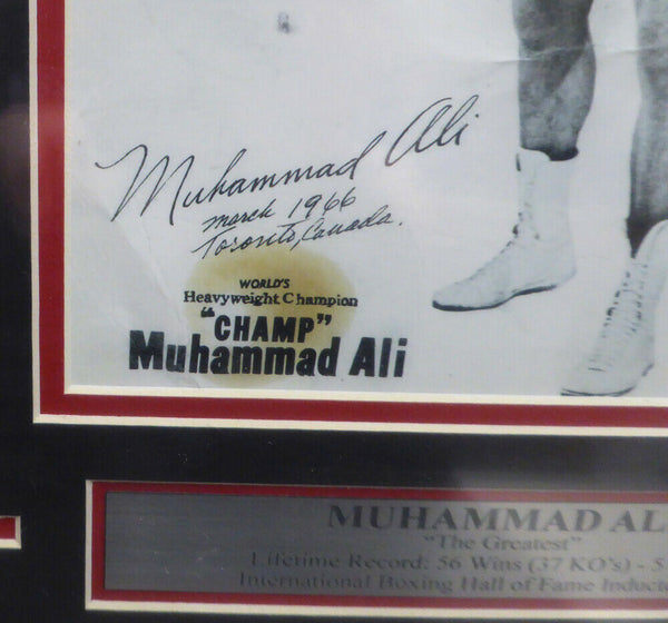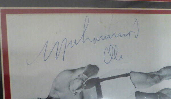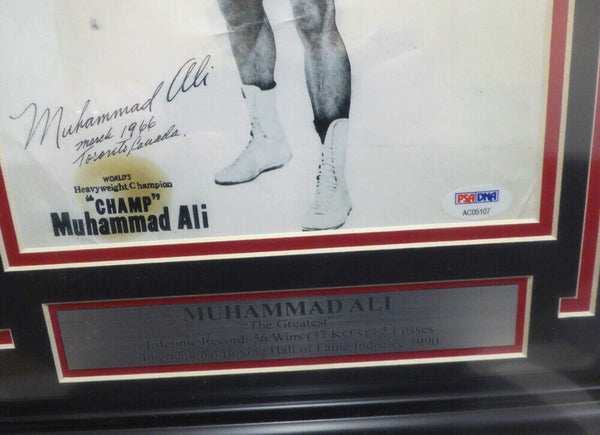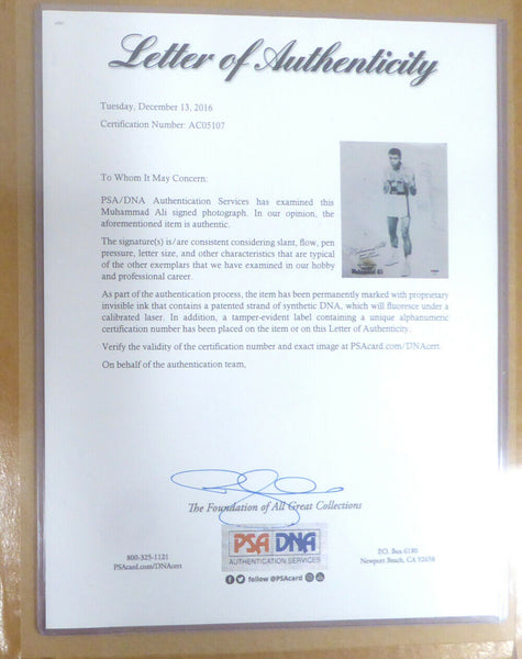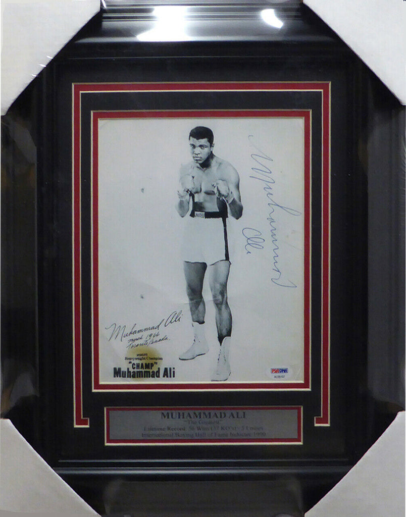 This is a framed 8x10 photo, approximately 15x18 with the frame, that has been hand signed by Muhammad Ali. It has been authenticated by PSA/DNA and comes with their sticker and matching full page certificate of authenticity.A There are some bends, stains and creases on the photo, as shown in the pictures.