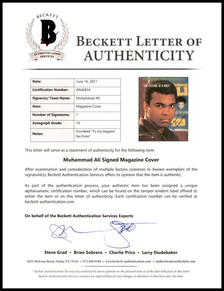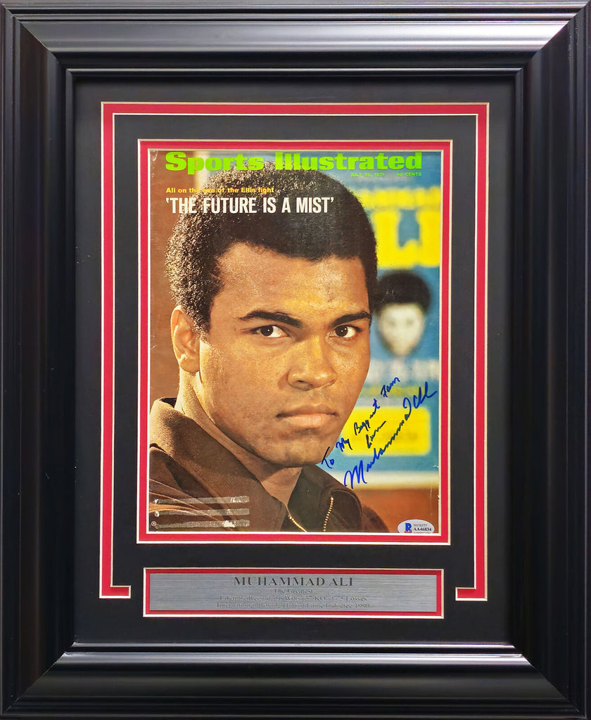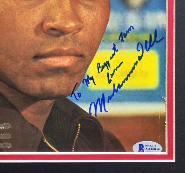 This is a Framed 8x11 Sports Illustrated Magazine Cover, approximately 16x20 with the frame, that has been hand signed by Muhammad Ali. The condition of the signature was graded a Gem Mint 10 by Beckett BAS. This item was inscribed "To My Biggest Fan." There are creases in the item as shown. This item has been certified authentic by Beckett Authentication (BAS) and comes with their tamper-proof hologram and matching full-page certificate of authenticity.