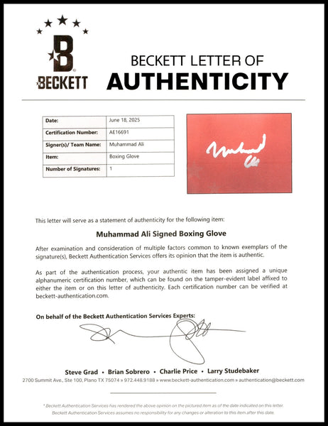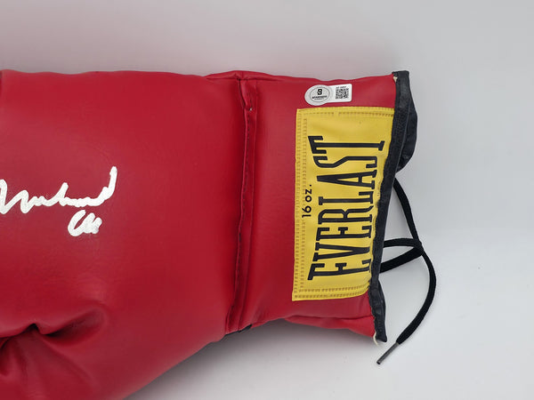 This is a Red Everlast Boxing Glove that has been hand signed by Muhammad Ali. This glove is right handed. This item has been certified authentic by Beckett Authentication (BAS) and comes with their tamper-proof hologram and matching full-page certificate of authenticity.