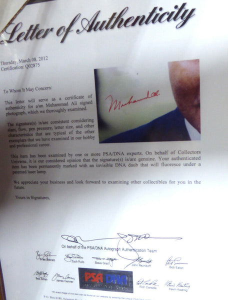 This is a framed 16x20 photo, approximately 24x28 with the frame, that has been hand signed by Muhammad Ali. It has been authenticated by PSA/DNA and comes with their sticker and matching full page certificate of authenticity.A NOTE: The photo has some tears and creases throughout it, as shown in the pictures.