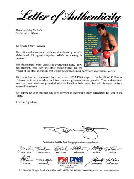 This is a Magazine that has been hand signed by Muhammad Ali. It has been certified authentic by PSA/DNA and comes with their sticker and matching full page certificate of authenticity.