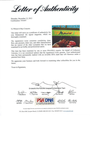 This is a Sports Illustrated Magazine that has been hand signed by Muhammad Ali. It has been certified authentic by PSA/DNA and comes with their sticker and matching full page certificate of authenticity.