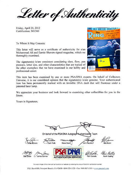 This is a Magazine Cover that has been hand signed by Muhammad Ali & Ernie Shavers. Please Note: This is the Cover of the Magazine as shown. This is NOT the entire magazine. It has been certified authentic by PSA/DNA and comes with their sticker and matching full page certificate of authenticity.