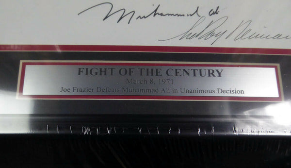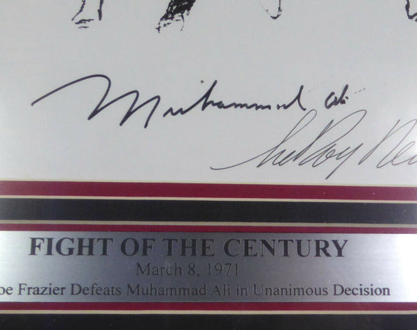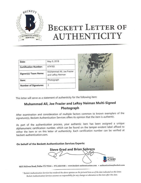 This is a Framed Lithograph Photo, approximately 20x24 with the frame, that has been hand signed by Muhammad Ali, Joe Frazier & LeRoy Neiman. It has been authenticated by Beckett (BAS) and comes with their sticker and matching full page certificate of authenticity.