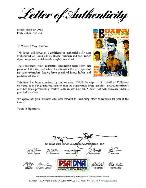 This is a Magazine Cover that has been hand signed by Muhammad Ali, Jimmy Ellis, Boone Kirkman & Joe Frazier. Please Note: This is the Cover of the Magazine as shown. This is NOT the entire magazine. It has been certified authentic by PSA/DNA and comes with their sticker and matching full page certificate of authenticity.