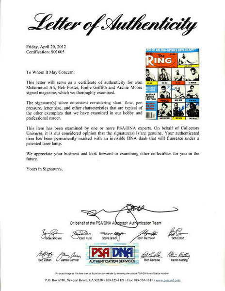 This is a Magazine Cover that has been hand signed by Muhammad Ali, Bob Foster, Emile Griffith & Archie Moore. Please Note: This is the Cover of the Magazine as shown. This is NOT the entire magazine. It has been certified authentic by PSA/DNA and comes with their sticker and matching full page certificate of authenticity.