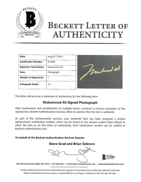 This Autographed Limited Edition #1338/1996 Autograph Graded Gem Mint 10! 16x20 Framed Photo has been Personally Signed by Muhammad Ali. This item is 100% Authentic to include a Certificate of Authenticity (COA) / hologram by Beckett Authentication Services. The authenticity can be verified on Beckett Authentication Services website. This item has been professionally framed to overall dimensions of approximately 20.25 x 24.25 inches. Please refer to photos for condition of the item. We only offers Authentic Autographs by Muhammad Ali through Signings, In-Person Signings or Private Collections to include a 100% money back Lifetime Authenticity Guarantee.