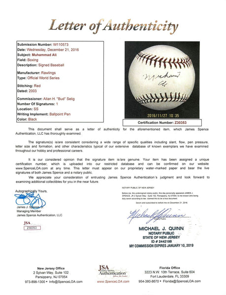 This is a 2003 World Series Signed Authentic OML Baseball that has been Personally Signed & Autographed by Muhammad Ali. This item is 100% Authentic to include a Certificate of Authenticity (COA) / hologram by JSA #Z30353. We offers a 100% Lifetime Guarantee on all Autographed & Signed Muhammad Ali memorabilia.