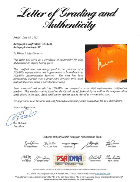 This Autographed Auto Graded Gem Mint 10! Red Everlast Boxing Glove has been Personally Signed by Muhammad Ali. This item is 100% Authentic and comes with a PSA/DNA Certification Card and a matching numbered Hologram. This is a PSA in the Presence Authenticated item which means a PSA representative was present when this item was being signed. The authenticity can be verified on Professional Sports Authenticator website.