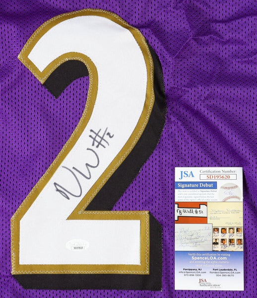 Custom on-field style jersey with everything sewn on, size XL. Hand-signed by Nate Wiggins. The autograph(s) includes an official James Spence Authentication (JSA) "Signature Debut" hologram and COA. "Signature Debut" is the autographed memorabilia equivalent to a rookie card. The JSA definition of a "Signature Debut" is as follows: "Any item that is autographed and received by JSA prior to the last game of the signer's official rookie season.Authentication: JSA COA