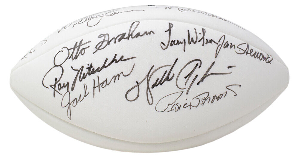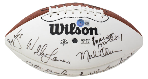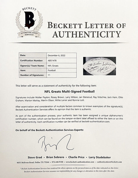 Featured is a multi signed NFL greats football, with 11 signatures. This football was hand signed by alter Payton, Rosey Brown, Larry Wilson, Jan Stenerud, Ray Nitschke, Jack Ham, Otto Graham, Marion Motley, Merlin Olsen, Willie Lanier and Ronnie Lott and has been authenticated by Beckett authentication services. Included with the football is a Beckett hologram and letter of authentication. **Please note: This ball does not hold air.** SPECIFICATIONS Autographed By: Walter Payton Team: Chicago Bears Sport: Football Authentication: Beckett Grading Services