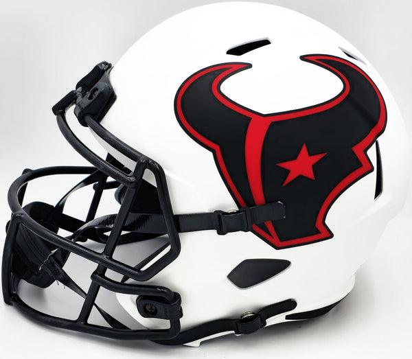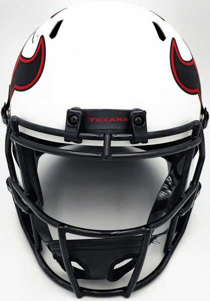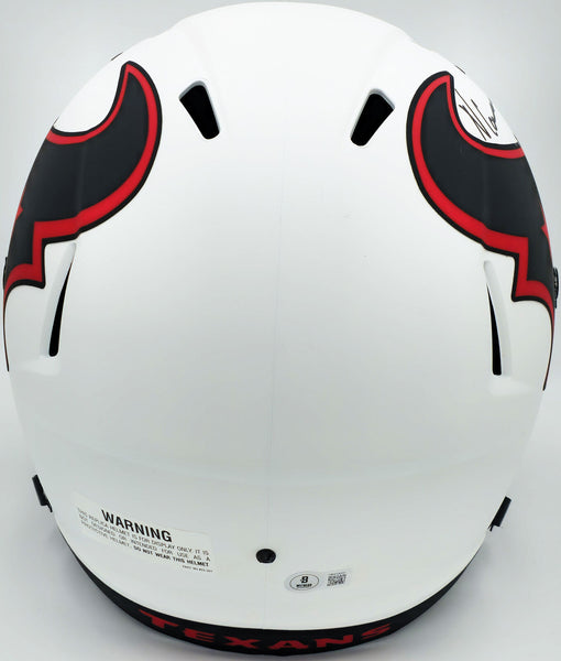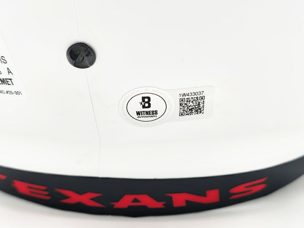 This is a Houston Texans Lunar Eclipse White Full Size Speed Replica Helmet that has been hand signed by Nico Collins. The Eclipse helmets are delicate and may have some marks or scratches on them. This item has been witnessed and certified authentic by Beckett Authentication (BAS) and comes with their tamper-proof witness sticker.