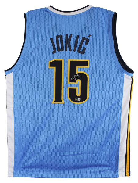 This Autographed Light Blue Throwback Pro Style Jersey has been Personally Signed by Nikola Jokic of the Denver Nuggets. This item is 100% Authentic to include a hologram by Beckett Authentication Services. This item will come with an affixed Beckett Authentication Services (BAS) authentication sticker, which includes a scannable QR code to verify authenticity. Please note that Beckett no longer provides serial-numbered COA cards, and the attached BAS sticker will serve as the complete authentication for this item. This is a BAS Witnessed Protection Program item which means a Beckett Authentication Service representative was present when this item was being signed. We have multiples of this same item. While the photographs are representative of this item, the size, placement and strength of the signature may vary. Each item is hand signed, therefore, each autograph is unique. This is a X-Large sized, non-branded, custom-stitched Jersey.