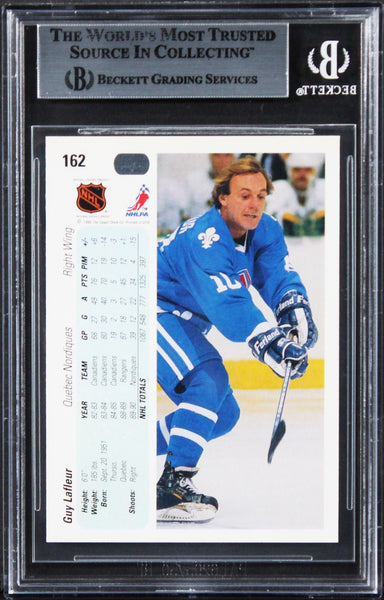 This Autographed 1990 Upper Deck #162 Card has been Personally Signed by Guy Lafleur of the Quebec Nordiques. This item is 100% Authentic, it comes slabbed and authenticated by Beckett Authentication Services. The authenticity can be verified on Beckett Authentication Services website.