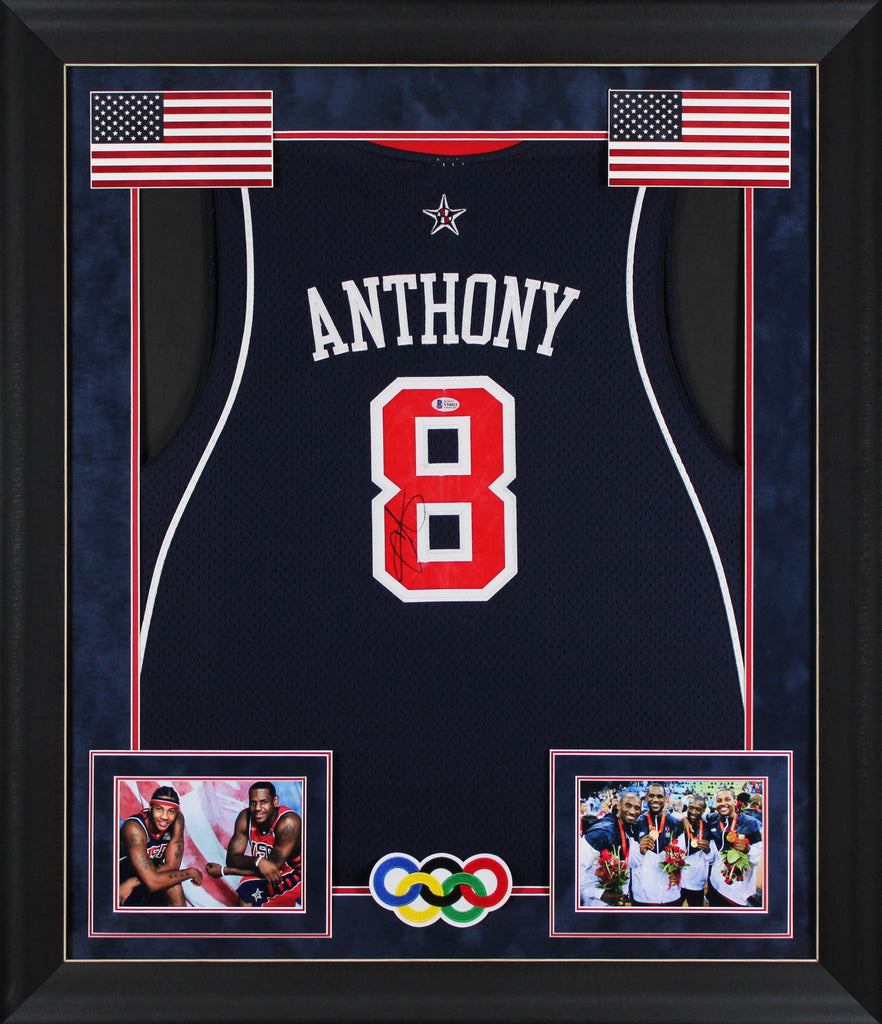 This Autographed Navy Blue Team USA Reebok Framed Jersey has been Personally Signed by Carmelo Anthony of the Denver Nuggets. This item is 100% Authentic to include a Certificate of Authenticity (COA) / hologram by Beckett Authentication Services. The authenticity can be verified on Beckett Authentication Services website. This item has been professionally framed to overall dimensions of approximately 32 x 37 inches.