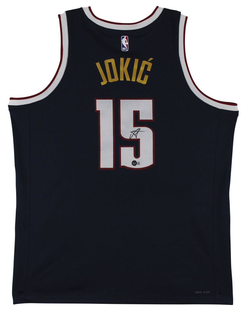 This Autographed Navy Blue Nike Swingman Jersey has been Personally Signed by Nikola Jokic of the Denver Nuggets. This item is 100% Authentic to include a hologram by Beckett Authentication Services. This item will come with an affixed Beckett Authentication Services (BAS) authentication sticker, which includes a scannable QR code to verify authenticity. Please note that Beckett no longer provides serial-numbered COA cards, and the attached BAS sticker will serve as the complete authentication for this item. We have multiples of this same item. While the photographs are representative of this item, the size, placement and strength of the signature may vary. Each item is hand signed, therefore, each autograph is unique. This is a X-Large sized, non-branded, custom-stitched Jersey.