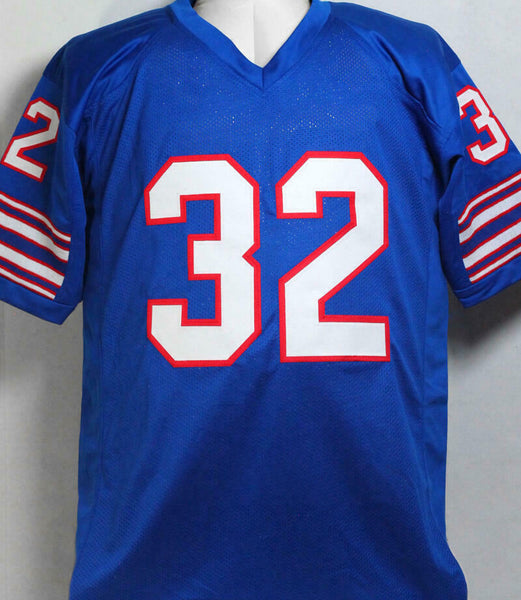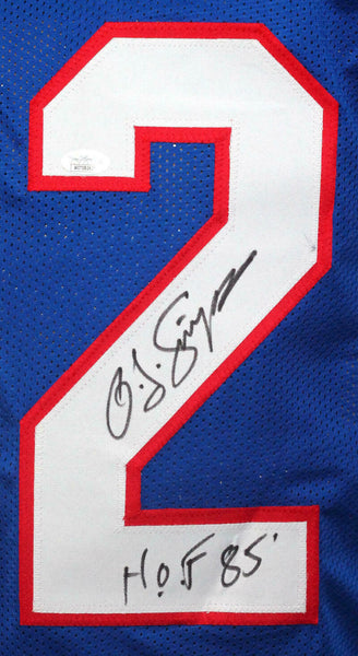 O. J. Simpson Autographed Blue Pro Style Jersey w/ HOF- JSA W Auth *MB2 THIS IS NOT AN NFL JERSEY. THIS HAS NO TAGS, NO LOGOS, NO EMBLEMS. This is a hand autographed Jersey of O. J. Simpson that is Custom Made (non name brand) Authentic Style Jersey with stitched letters and numbers. This item has a James Spence Witness Protection Authentication, which comes with a numbered sticker and a matching JSA Certificate of Authenticity. You can view this item on the SpenceLOA website and it shows when and where the item was signed. It was signed either at a public autograph appearance or a private signing. This is a stock photo of the item. Although you may not receive this exact item, the item you receive is virtually identical and brand new in great shape. Jersey size is XL.