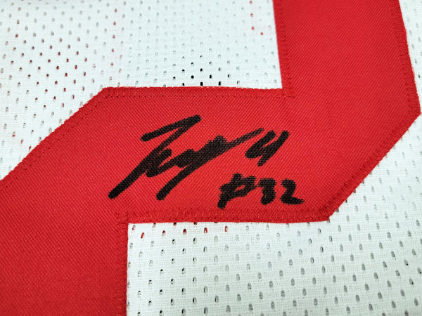 This is a White Jersey that has been hand signed by TreVeyon Henderson. This is a custom jersey with no name brand. The approximate size is XL. It has nice sewn in name and numbers. This item has been certified authentic by Beckett Authentication (BAS) and comes with their tamper-proof QR Code sticker that can be verified on the Beckett-authentication.com.