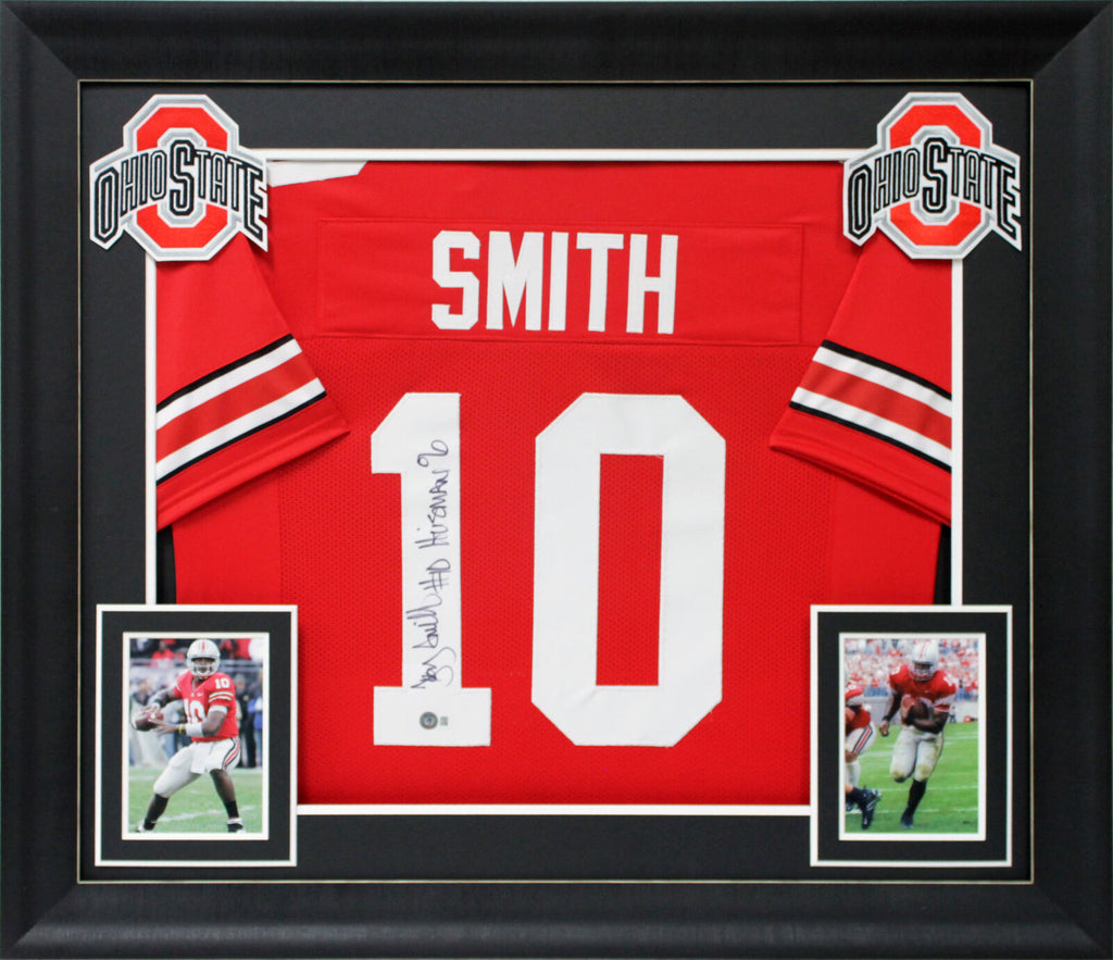 This Autographed Red Pro Style Framed Jersey with the inscription of "Heisman 06" has been Personally Signed by Troy Smith of the Ohio State Buckeyes. This item is 100% Authentic to include a hologram by Beckett Authentication Services. This item will come with an affixed Beckett Authentication Services (BAS) authentication sticker, which includes a scannable QR code to verify authenticity. Please note that Beckett no longer provides serial-numbered COA cards, and the attached BAS sticker will serve as the complete authentication for this item. This is a BAS Witnessed Protection Program item which means a Beckett Authentication Service representative was present when this item was being signed. We conducted an autograph signing with Troy Smith where multiples of the same item were signed. While the photographs are representative of this item, the size, placement and strength of the signature may vary. Each item is hand signed, therefore, each autograph is unique. This item can be verified through BAS Witnessed. This item has been professionally framed to overall dimensions of approximately 32 x 37 inches. This is a X-Large sized, non-branded, custom-stitched Framed Jersey. This jersey will be framed to order, it will take 3-4 days from purchase date for it to ship.