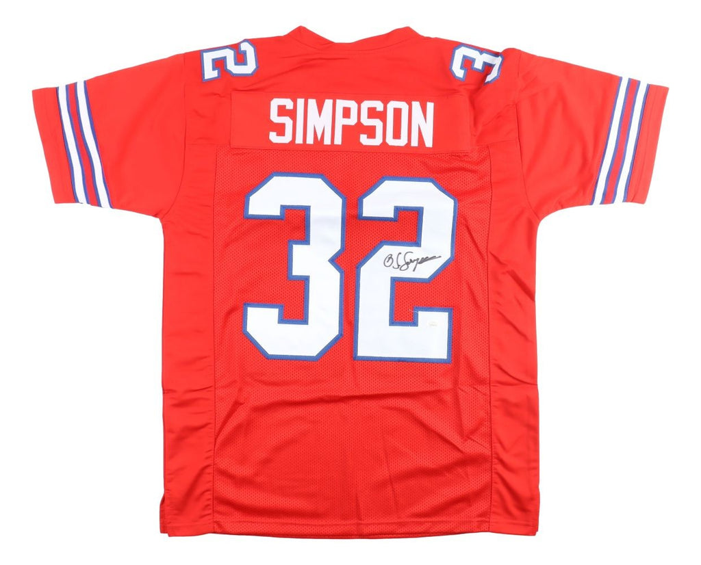 Featured is an OJ Simpson signed custom football jersey. This jersey has been hand signed by Simpson and comes with the JSA hologram and certificate of authenticity. This jersey features professionally sewn letters and numbers and is size XL. This jersey has no team tags or emblems and is intended as a sports collectible!. SPECIFICATIONS Autographed By: OJ Simpson Team: Buffalo Bills Sport: Football Authentication: James Spence Authentication (JSA)