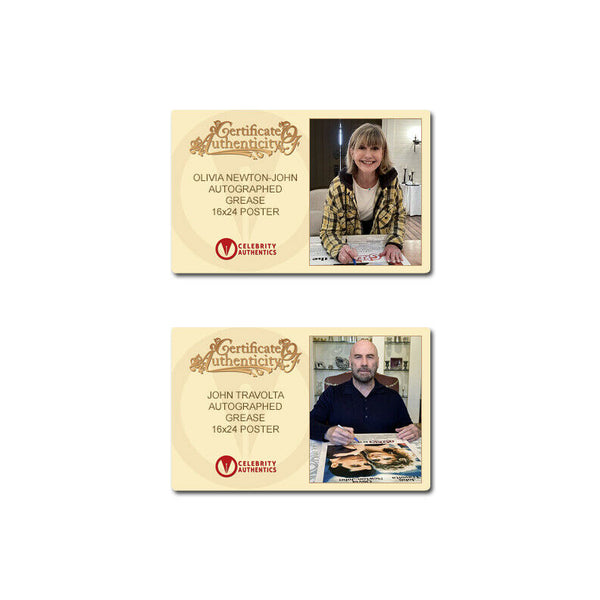Celebrity Authentics was the exclusive autograph partner of Olivia Newton-John. Please be aware most other online autographs purported to be Ms. Newton-John's are forgeries. Ms. Newton-John only signed with Celebrity Authentics so be sure the item you choose is affixed with the Celebrity Authentics Authentication Hologram for her genuine signature.This Grease 16x24 Poster featuring the iconic image of Sandy and Danny has been personally hand-signed by Olivia Newton-John and John Travolta during their signings with Celebrity Authentics. Good girl Sandy Olsson and greaser Danny Zuko fell in love over the summer. When they unexpectedly discover they're now in the same high school, will they be able to rekindle their romance? From the most successful musical of all-time, this classic poster ships affixed with Celebrity Authentics serial-numbered and tamper evident Authentication Hologram and includes Celebrity Authentics Certificates of Authenticity featuring picture of Olivia and John signing poster. Please note: with multiples signed by the actor, a sample photo is used from stock to represent what you will receive. Exact autograph size and placement may vary.
