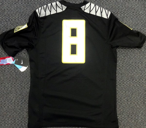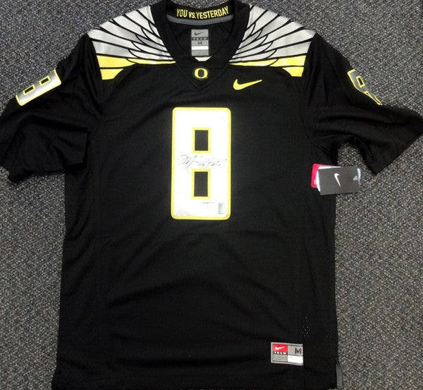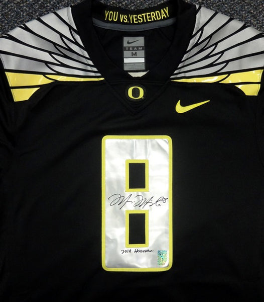 This is a Black Nike Oregon Ducks Jersey that has been hand signed by Marcus Mariota. Along with the autograph, this item also comes with the inscription which reads "2014 Heisman". This one is size Medium. This item has the official tamper-proof Marcus Mariota serial numbered hologram and matching certificate of authenticity.