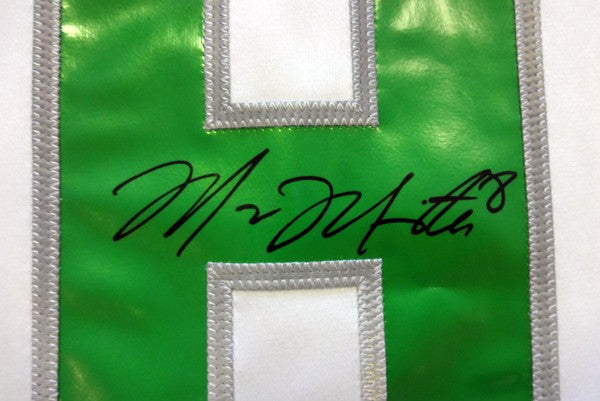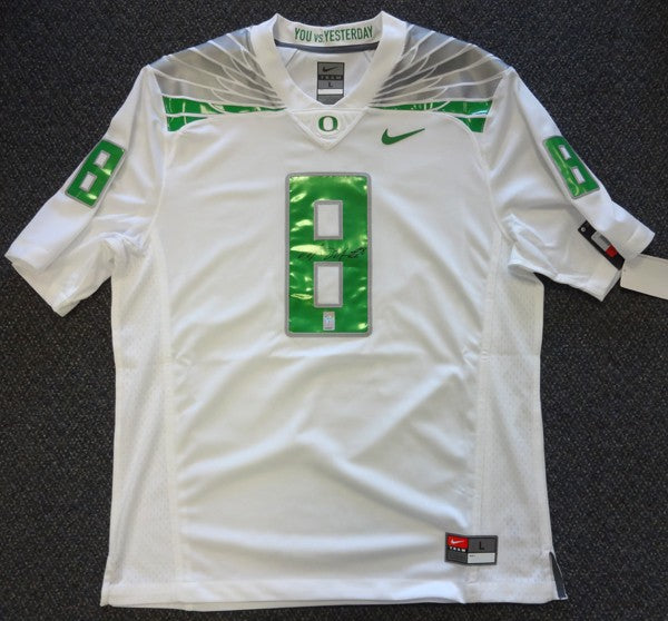 This is a White Nike Oregon Ducks Jersey that has been hand signed by Marcus Mariota. This one is size Large. This item has the official tamper-proof Marcus Mariota serial numbered hologram and matching certificate of authenticity.