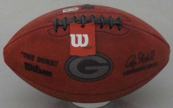 Wilson Authentic Duke Packers Logo Football hand signed by former Green Bay Packers running back AARON JONES. The signature is in Silver paint pen. This item was signed at a private signing with us and would make a great addition to any Packers collection! This item is guaranteed to be 100% authentic and will include a COA hologram from Beckett authentication.