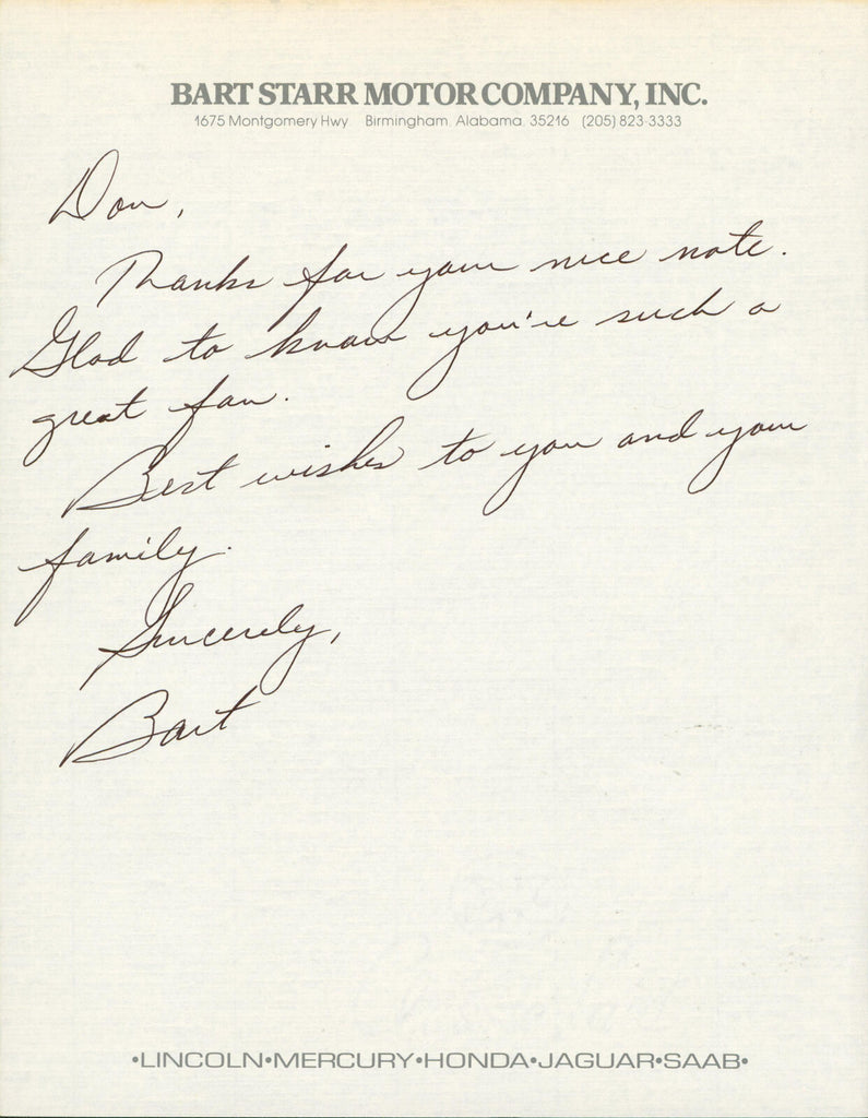 This Autographed 8.5x11 Handwritten Letter has been Personally Signed by Bart Starr of the Green Bay Packers. This item is 100% Authentic to include a hologram by Beckett Authentication Services. This item will come with an affixed Beckett Authentication Services (BAS) authentication sticker, which includes a scannable QR code to verify authenticity. Please note that Beckett no longer provides serial-numbered COA cards, and the attached BAS sticker will serve as the complete authentication for this item. The authenticity can be verified on Beckett Authentication Services website.