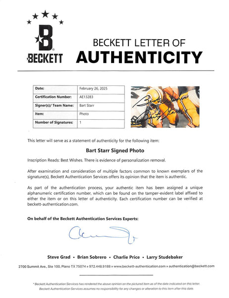 This Autographed 8x10 Photo with the inscription of "Best Wishes" has been Personally Signed by Bart Starr of the Green Bay Packers. This item is 100% Authentic to include a Certificate of Authenticity (COA) / hologram by Beckett Authentication Services. The authenticity can be verified on Beckett Authentication Services website. There is evidence of a personalization removal.