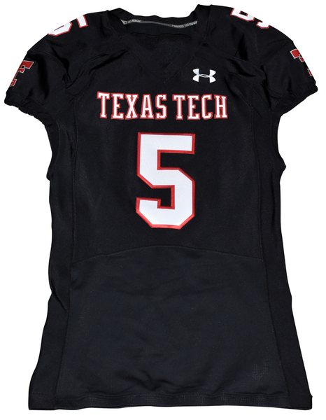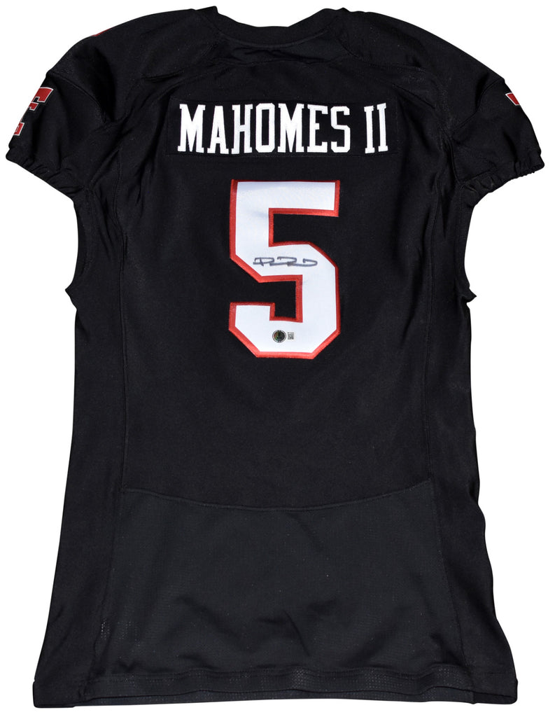 Patrick Mahomes II, former star quarterback for the Texas Tech Red Raiders, has hand signed this 2014 team issued Texas Tech Under Armour jersey at a private signing. This jersey was never actually game worn. This item is authenticated by Beckett Authentication Services and was signed in the presence of one of their representatives. Their tamper-evident hologram featuring a QR code and serial number is on the item. The authenticity can be verified online by entering the serial number or scanning the QR code.