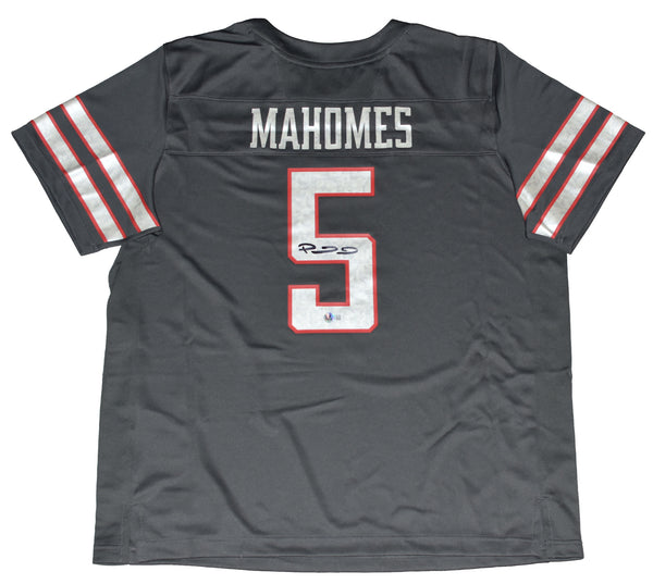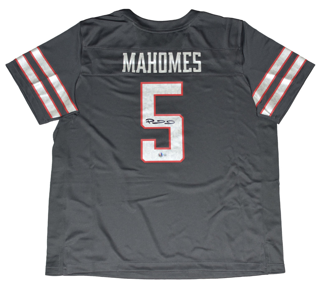 Patrick Mahomes, former star quarterback for the Texas Tech Red Raiders, has hand signed this Adidas Premier Galvanized jersey at a private signing. Jersey is new with tags attached and all letters/numbers are screen print. This item is authenticated by Beckett Authentication Services and was signed in the presence of one of their representatives. Their tamper-evident hologram featuring a QR code and serial number is on the item. The authenticity can be verified online by entering the serial number or scanning the QR code.Item pictured may not be the exact item you will receive. It will be similar quality, and we guarantee your satisfaction.