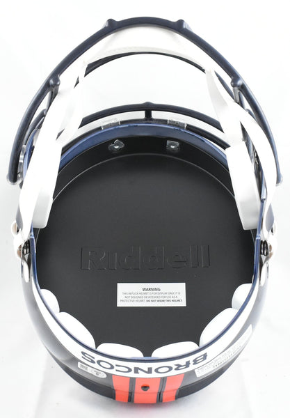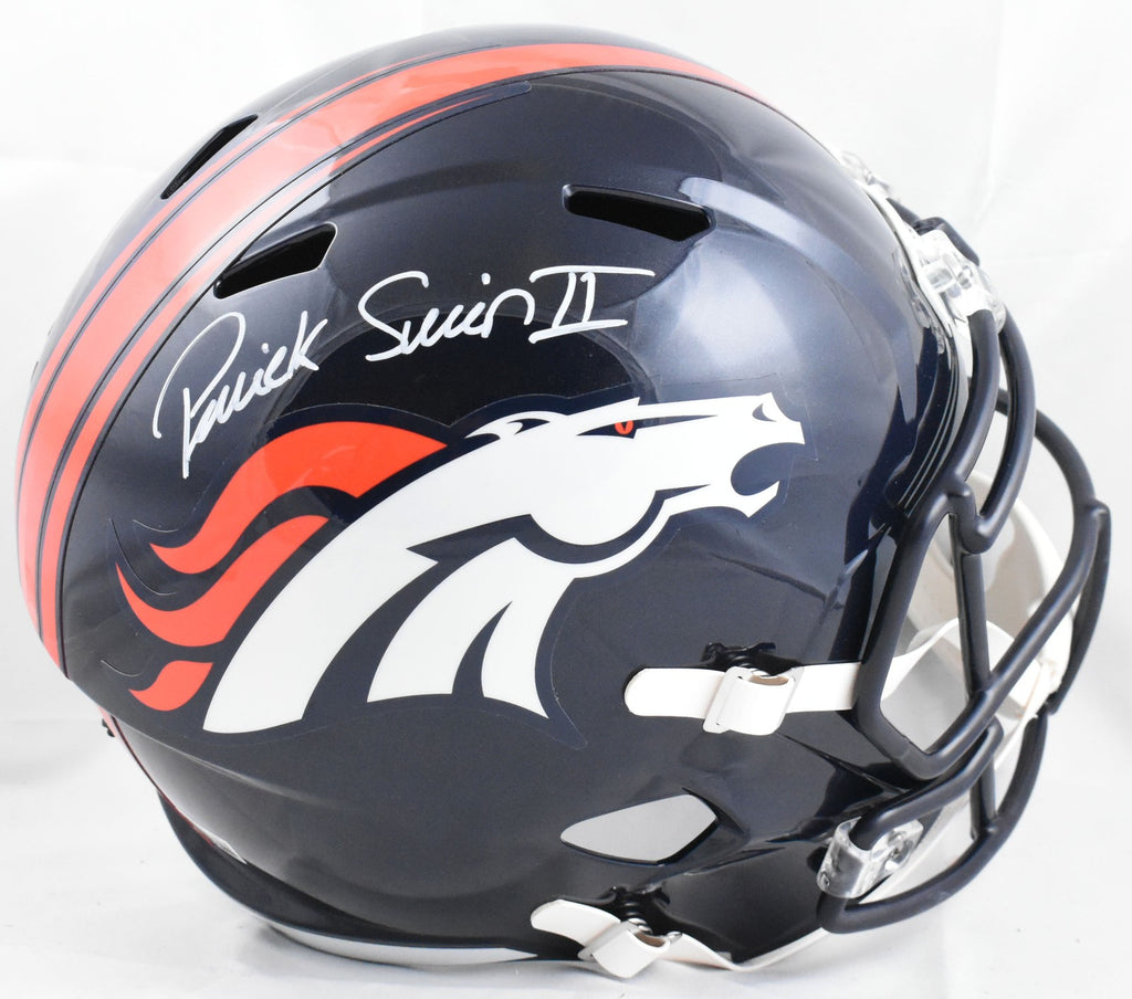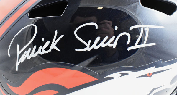 This is a Patrick Surtain II of the Denver Broncos Autographed Riddell football full size Speed Replica Helmet. This item has a Beckett Witnessed Authentication, which comes with a numbered hologram and a QR code for verification. You can view this item on the Beckett Authentication website and it shows when and where the item was signed. It was signed either at a public autograph appearance or a private signing. This is a stock photo of the item. Although you may not receive this exact item, the item you receive is virtually identical, brand new, and in great shape. *Autograph location may vary* This is a Patrick Surtain II of the Denver Broncos Autographed Riddell football full size Speed Replica Helmet. This item has a Beckett Witnessed Authentication, which comes with a numbered hologram and a QR code for verification. You can view this item on the Beckett Authentication website and it shows when and where the item was signed. It was signed either at a public autograph appearance or a private signing. This is a stock photo of the item. Although you may not receive this exact item, the item you receive is virtually identical, brand new, and in great shape. *Autograph location may vary*