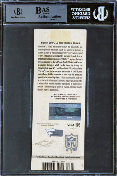 This Autographed Super Bowl LV Full Ticket Stub with the inscription of "SB LV MVP" has been Personally Signed by Tom Brady of the New England Patriots. This item is 100% Authentic, it comes slabbed and authenticated by Beckett Authentication Services. The authenticity can be verified on Beckett Authentication Services website. There is a crack in the slab, please refer to photos for condition prior to purchase.