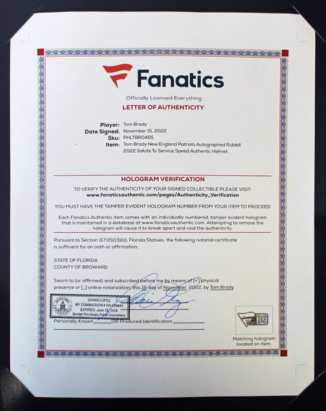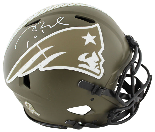 This Autographed Alternate Salute To Service Riddell Authentic Full Size Speed Proline Helmet has been Personally Signed by Tom Brady of the New England Patriots. This item is 100% Authentic to includes a numbered hologram by Fanatics. The authenticity can be verified on Fanatics website.