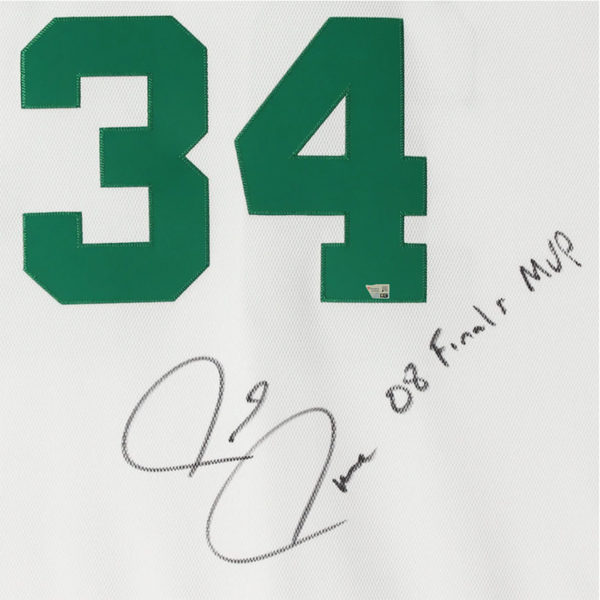 Paul Pierce Autographed/Inscribed "08 Finals MVP" on Front Boston Celtics White 2007-08 NBA Finals Logo Mitchell & Ness Authentic Jersey FanaticsThis jersey has been personally hand-signed by Paul Pierce. It is officially licensed by the National Basketball Association and comes with an individually numbered, tamper-evident hologram from Fanatics Authentic. To ensure authenticity, the hologram can be reviewed online. This process helps to ensure that the product purchased is authentic and eliminates any possibility of duplication or fraud.Made in the USAPersonally Autographed by Paul PierceFanatics Authentic Presented by Mounted MemoriesIncludes tamper-evident hologram to ensure authenticityOfficially licensed This product is guaranteed authentic and includes a Fanatics Certificate of Authenticity and an accompanying tamper-evident Fanatics Hologram.