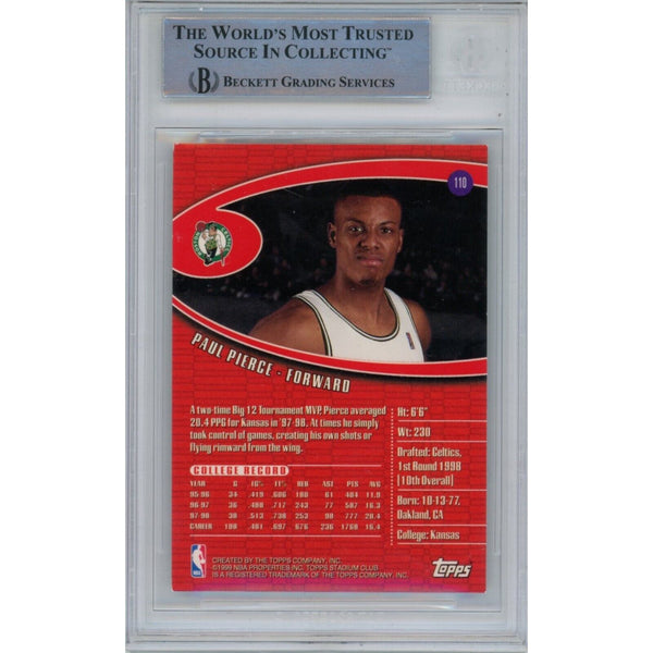 The number in the listing title is just an inventory sku for our records and is not the authentication number. The item pictured is the exact item you will receive, please see photos for condition. This is a Boston Celtics 1998 Stadium Club #110 Slabbed Trading Card that was personally autographed by Paul Pierce. Includes a certificate of authenticity from Beckett Authentication Services (BAS) and Denver Autographs.FREE SHIPPING within the USA on orders over $10!